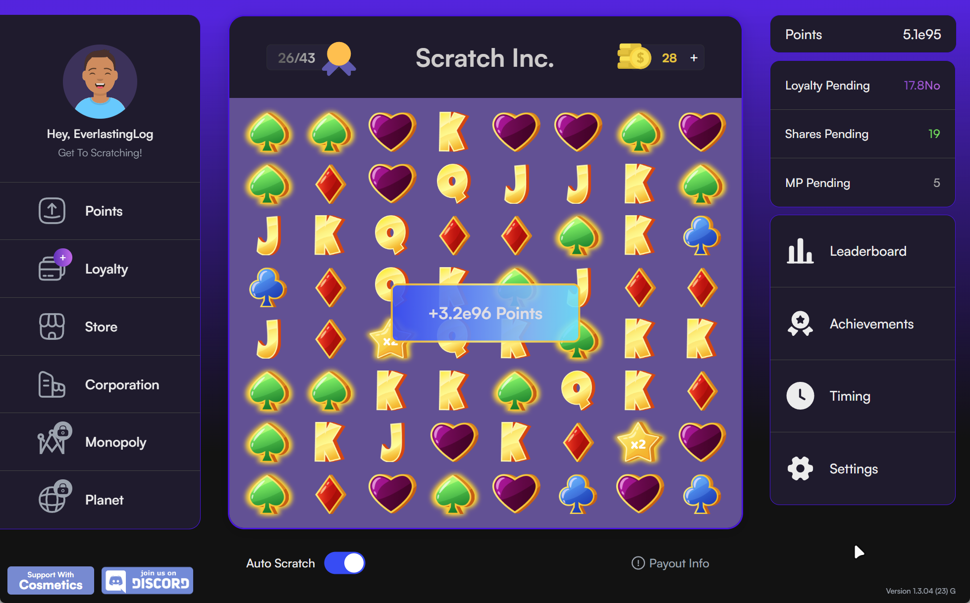 游戏的流程十分容易理解:我刮卡,我收米,我变强(卡变大),我看刮卡,我重置,我刮卡,我变强...,在冯友兰的人生四境界外,游戏额外点明了另两重境界,总括为积分→忠诚→商店→公司→垄断→星球,呃,什么玩意这是?尽管游戏在其最新一次v1.3.0.1版本更新中引入了大量包括简体中文的i18n补完,效果却也十分奇异搞笑。要我说,不如效仿前文介绍的《好极了2:风/波》,大大方方引入LLM国际化。